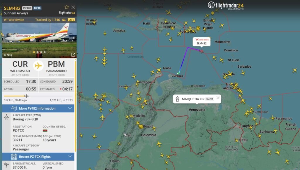 Uno de los ejemplos más recientes es el de Surinam Airways, cuya ruta desde Curazao a Surinam se ha desviado deliberadamente para bordear la FIR de Maiquetía, evitando ingresar al espacio aéreo venezolano. El desvío pone en evidencia la cautela de las compañías que antes cruzaban directamente por esa zona.