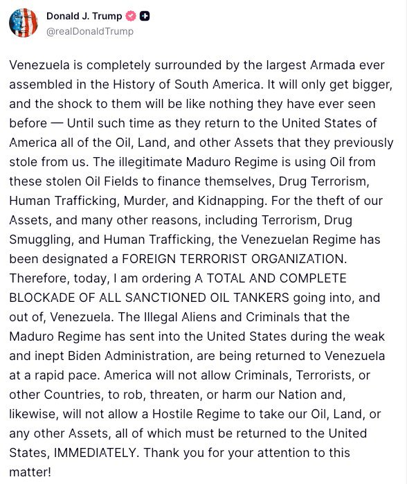 El presidente de Estados Unidos, Donald Trump, anunció una escalada sin precedentes en la confrontación con el Gobierno de Maduro, al ordenar un «bloqueo total y completo» de todos los tanqueros petroleros sancionados que operen en las costas de Venezuela.