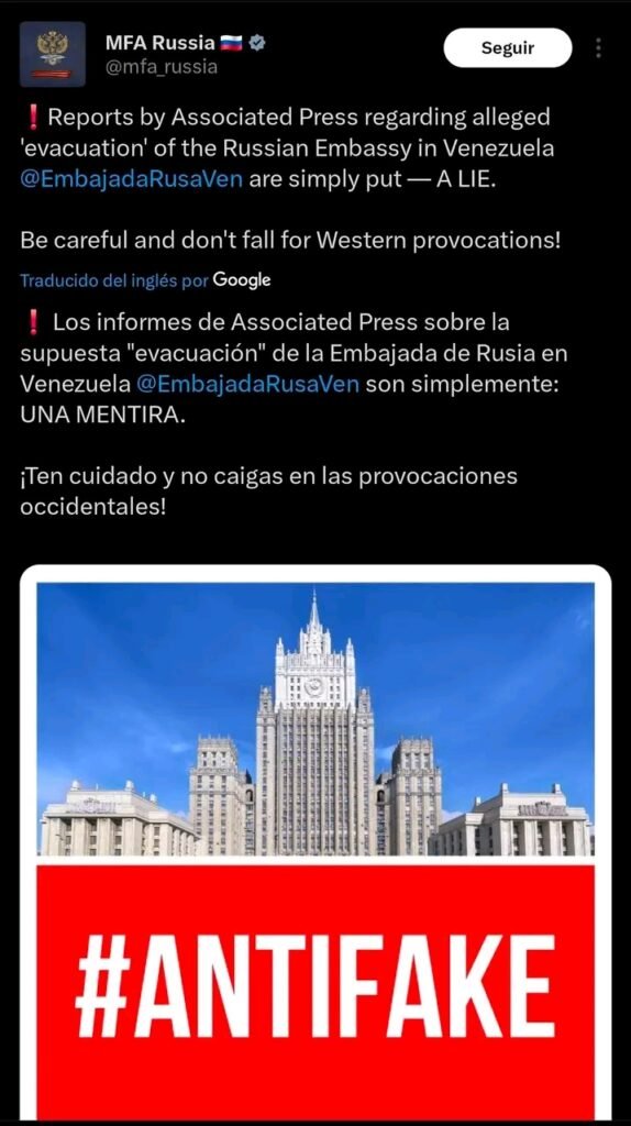 El Ministerio de Relaciones Exteriores de Rusia desmintió de forma categórica las informaciones difundidas por la agencia Associated Press (AP) sobre una supuesta “evacuación” de la Embajada rusa en Venezuela, calificándolas como “una mentira” y parte de una operación de desinformación.