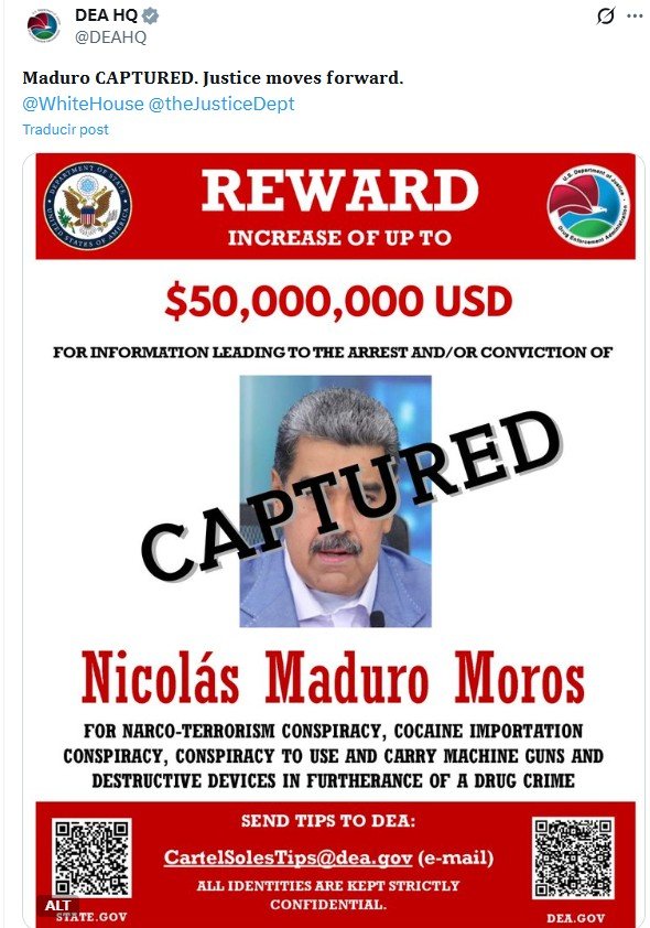 La Administración para el Control de Drogas estadounidense (DEA por sus siglas en inglés) actualizó en la noche del miércoles el afiche que ofrecía una recompensa económica por Nicolás Maduro, luego de que este fuera capturado junto a su esposa, Cilia Flores, por las fuerzas militares de Estados Unidos en un operativo que tuvo lugar en Venezuela durante la madrugada del sábado.