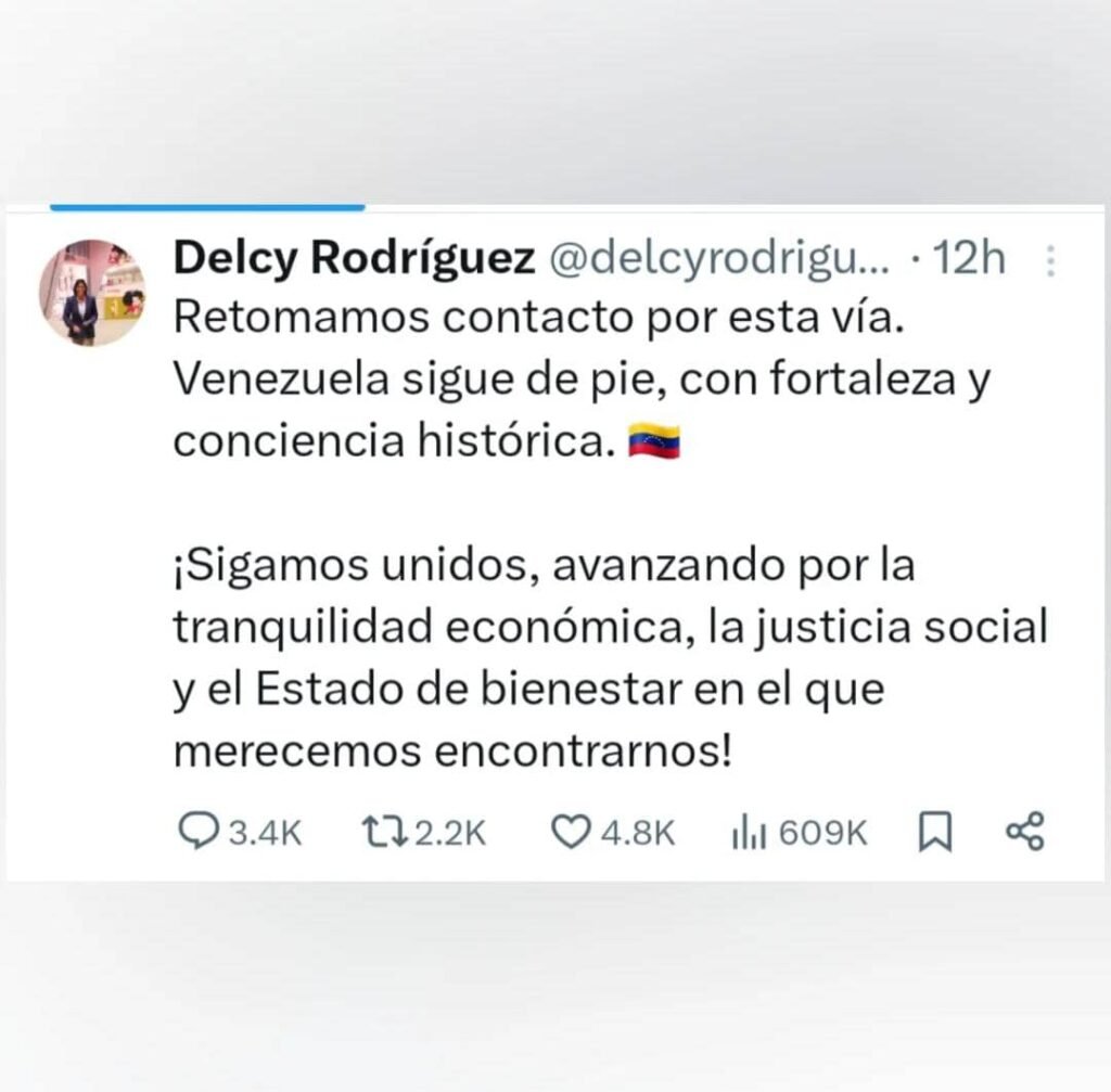 “Retomamos contacto por esta vía. Venezuela sigue de pie, con fortaleza y conciencia histórica. ¡Sigamos unidos, avanzando por la tranquilidad económica, la justicia social y el Estado de bienestar en el que merecemos encontrarnos!”, escribió.